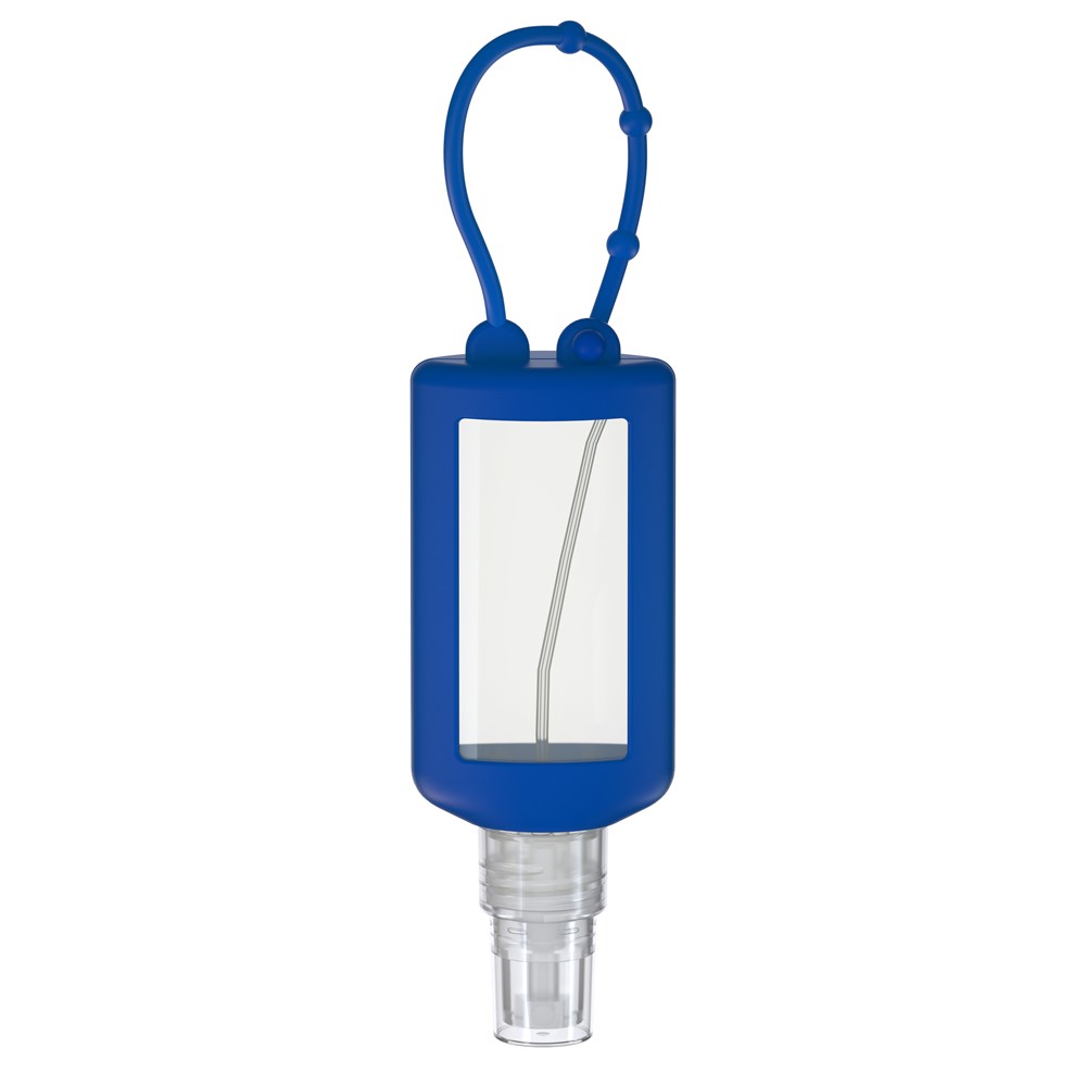 50 ml Flasche aus 100% recyceltem PET, transparent mit leichter R-PET-Färbung. Mit Pumpaufsatz "transparent" mit Schutzkappe; Silikonhülle und Schlaufe in blau. Nachfüllbar.