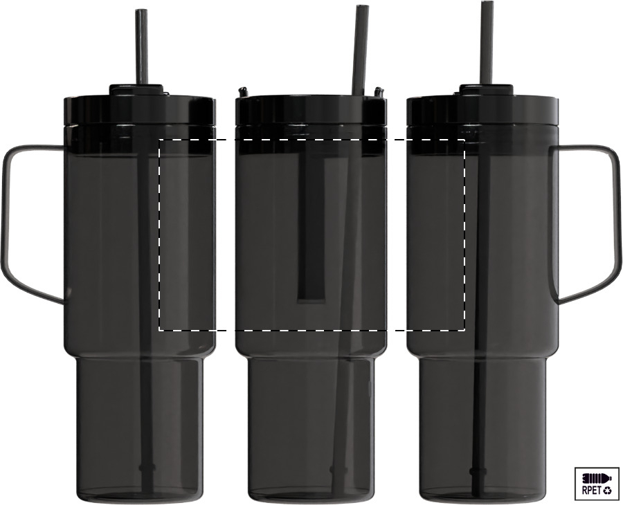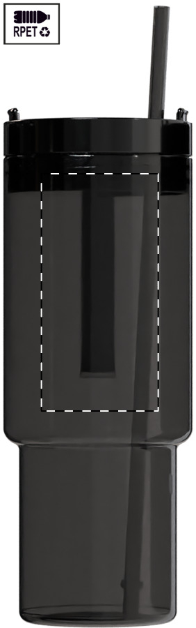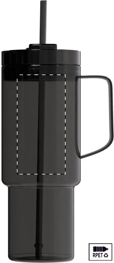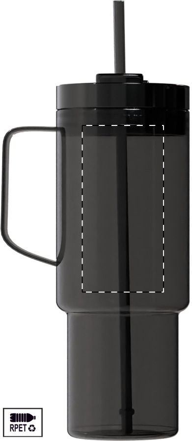 Einwandiger RPET-Reisebecher mit farblich passendem PP-Trinkdeckel und Strohhalm. Füllmenge: 1200 ml.