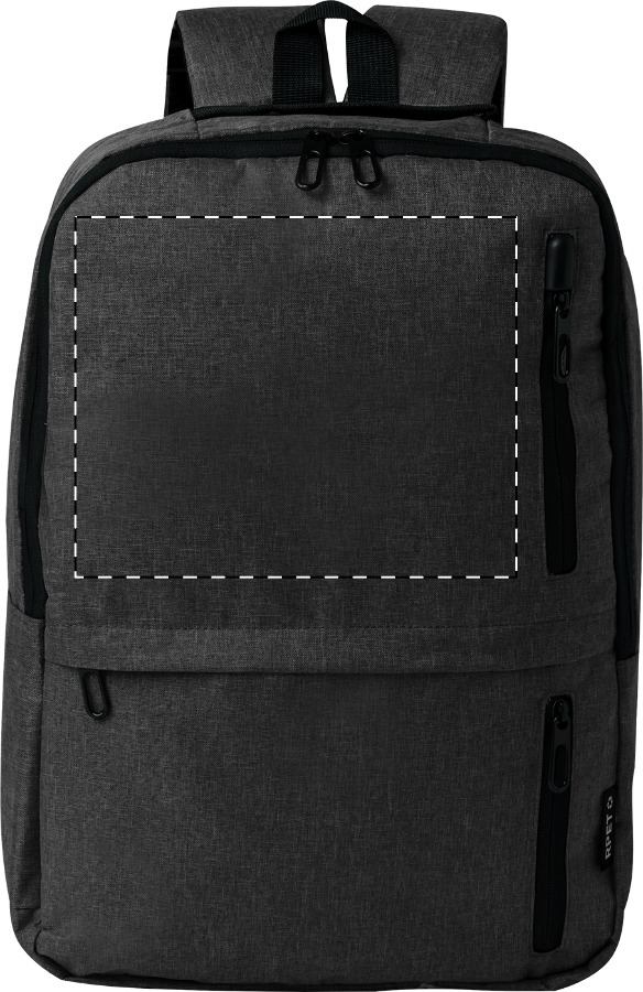 RPET-Rucksack mit Reißverschlussfächern, gepolstertem Laptop- (15") und Tabletfach (10"), gepolstertem Rücken und Schultergurten. Material: 600D RPET-Polyester. Mit RPET-Label.